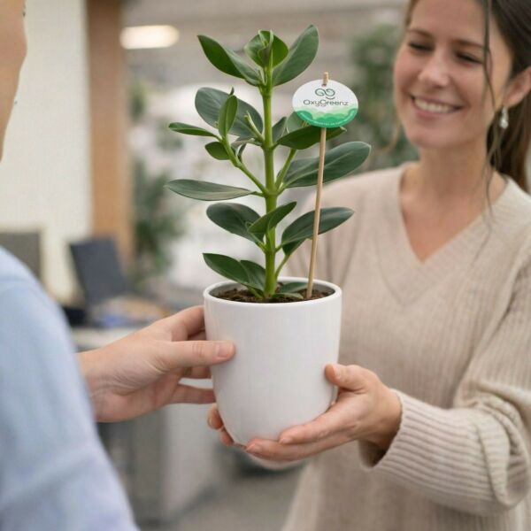 Het OxyGreenz®-concept biedt volop mogelijkheden om jouw geschenk extra persoonlijk te maken. Zo kun je kiezen voor een luxe witte keramieken pot of een duurzame papercup, een gepersonaliseerd plantenlabel met jouw logo of boodschap, en een bijpassend kaartje. Ook kan het keramiek worden voorzien van een opdruk met jouw bedrijfslogo, slogan of campagnebeeld, waarmee je een blijvende indruk achterlaat.